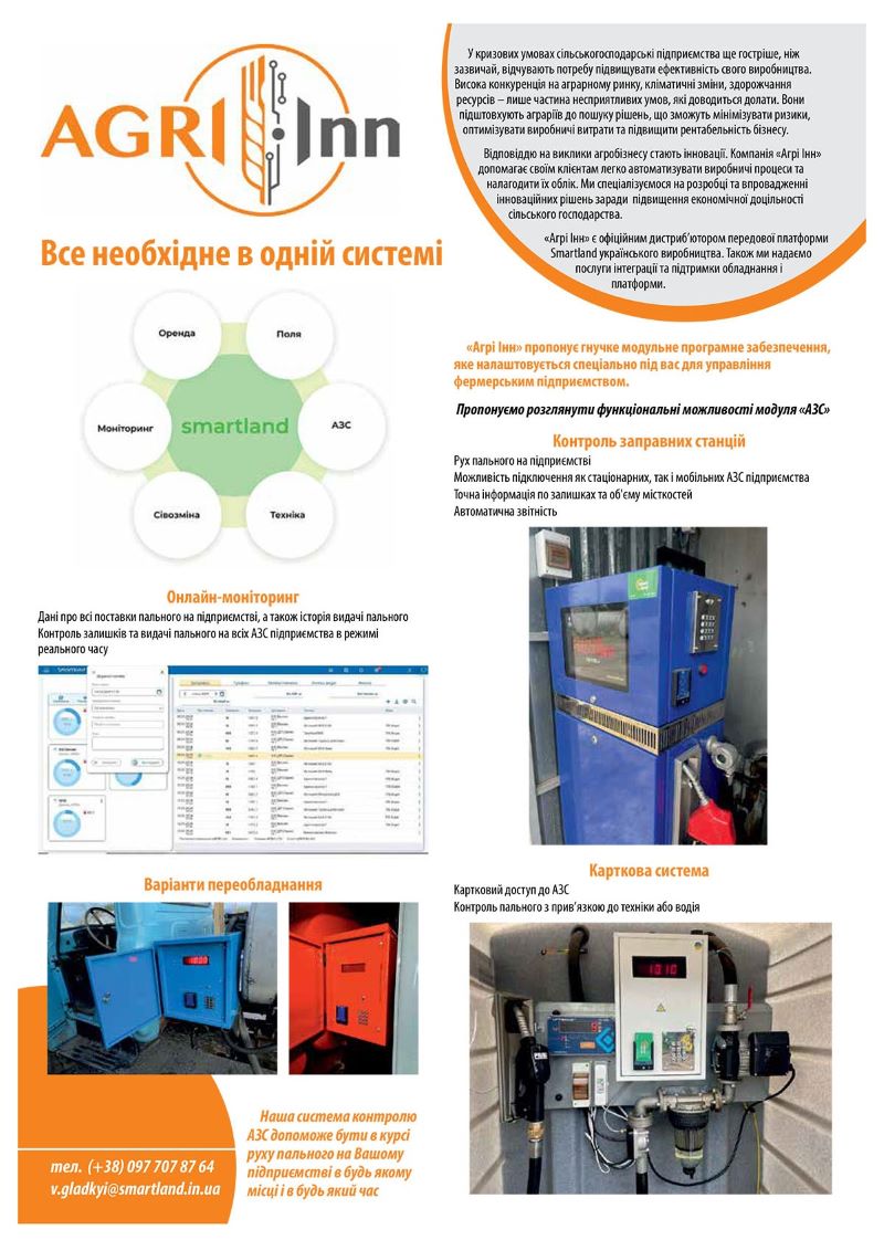 Компанія «Агрі Інн», яка є офіційним диприб'ютором передової платформи Smartland українського виробництва, допомагає аграріям легко автоматизувати виробничі процеси та налагодити їх облік. Вона спеціалізується на розробці та впровадженні інноваційних рішень заради підвищення економічної доцільності сільського господарства. «Агрі Інн» також надає послуги інтеграції та підтримки обладнання і платформи.