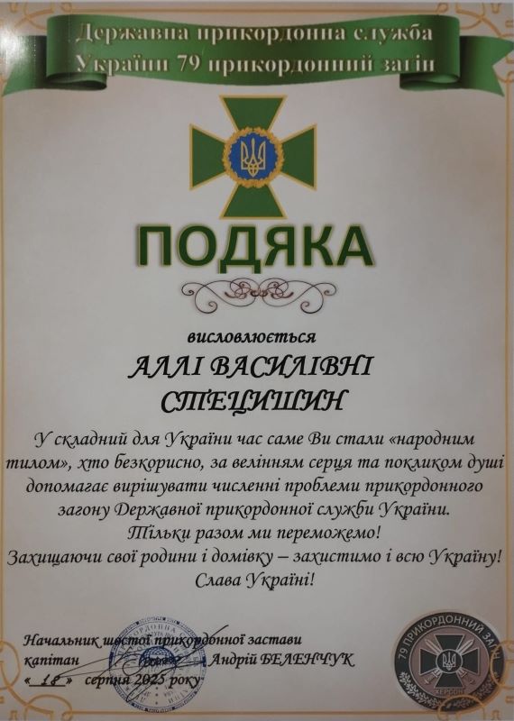 Нещодавно директорка ТОВ «Агропрогрес Теребовля» та ФГ «Калина Лошнівська» Алла Стечишин отримала Подяку від бійців 79-го прикордонного загону Державної прикордонної служби України. «Особлива подяка Аллі Стечишин за великі донати та м'ясні смаколики від її сільгосппідприємства, за що командування підрозділу передало для Алли Василівни Подяку, прапор підрозділу, підписаний бійцями на передовій, та кавун і диню з Херсона. Ще раз хочемо подякувати вам усім разом» – йдеться у дописі Сергія Чернівецького у соцмережі «Фейсбук».