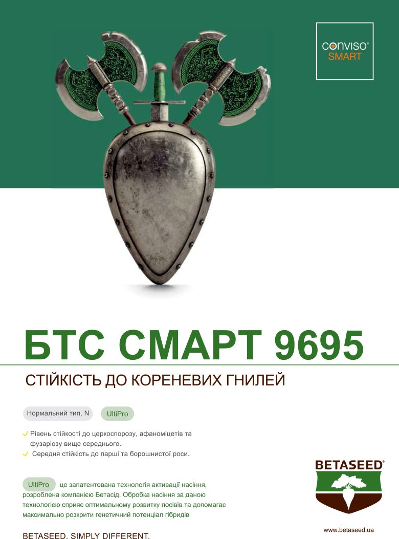 БТС СМАРТ 9695– стійкий до кореневих гнилей. Внесений до Державного реєстру сортів рослин, придатних для поширення в Україні у 2022 році. Рівень стійкості до церкоспорозу, афаноміцетів та фузаріозу вище середнього. Середня стійкість до парші та борошнистої роси.