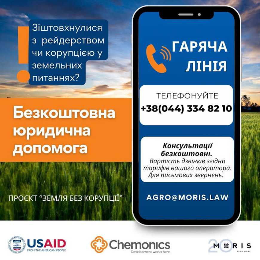 Для цього достатньо звернутися на гарячу лінію +38 (044) 334 82 10, створену в рамках проєкту «Земля без корупції», який реалізує юридична компанія MORIS за підтримки Програми USAID з аграрного та сільського розвитку (АГРО). Також можна отримати письмову консультацію, надіславши запит на електронну пошту: agro@moris.law.