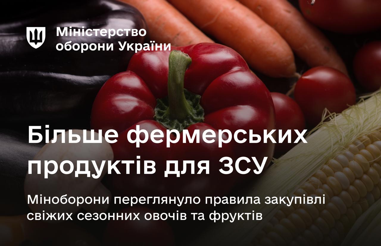 Для Збройних сил з 2025 року збільшать закупівлі фермерської продукції, яка зазвичай вирізняється високою якістю та доступнішою ціною. Як повідомляє прессслужба Міністерства оборони України, військові отримуватимуть більше свіжих сезонних фруктів та овочів, зокрема кабачків, томатів, картоплі, капусти, яблук тощо.