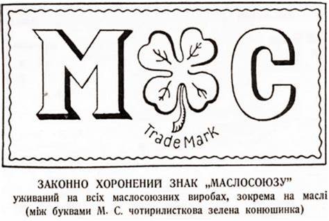 Фірмовим знаком "Маслосоюзу" був довгастий прямокутник, всередині якого між буквами "М" і "С" зображений зелений чотирилистник конюшини.