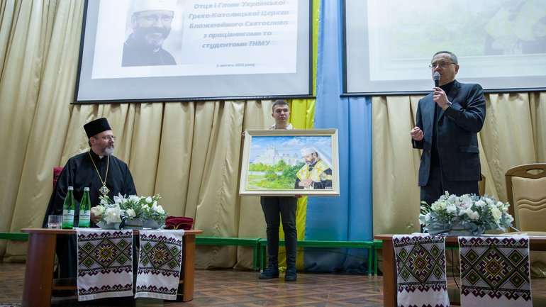 Після цього відбулася зустріч Глави Церкви з викладачами та студентами, під час якої ректор університету вручив Блаженнішому Святославу звання почесного професора медуніверситету, надане йому напередодні вченою радою ТНМУ.