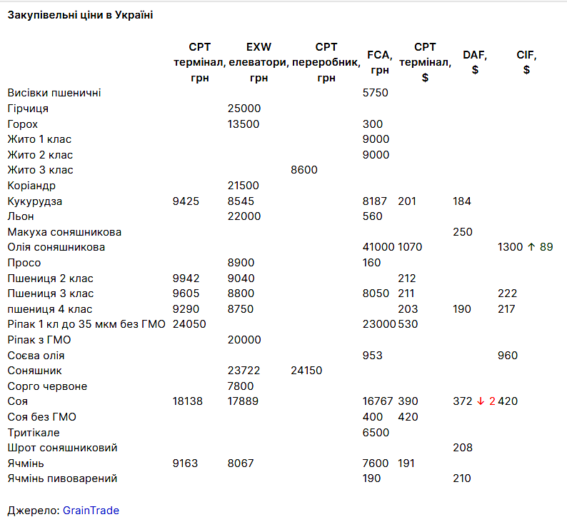 Середньозважені ціни закупівлі зернових та олійних культур в Україні на умовах CPT термінали, EXW елеватори, CPT переробники, FCA, CPT долар, FOB, DAF, CIF. Інформує AGRONAUT.