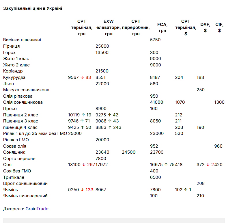 Середньозважені ціни закупівлі зернових та олійних культур в Україні на умовах CPT термінали, EXW елеватори, CPT переробники, FCA, CPT долар, FOB, DAF, CIF. Інформує AGRONAUT.