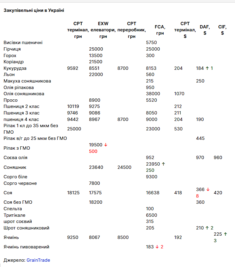 Середньозважені ціни закупівлі зернових та олійних культур в Україні на умовах CPT термінали, EXW елеватори, CPT переробники, FCA, CPT долар, FOB, DAF, CIF. Інформує AGRONAUT.