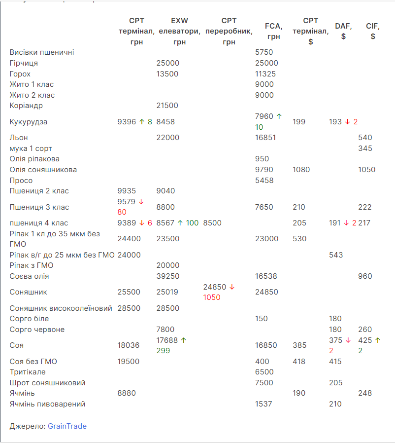 Середньозважені ціни закупівлі зернових та олійних культур в Україні на умовах CPT термінали, EXW елеватори, CPT переробники, FCA, CPT долар, FOB, DAF, CIF. Інформує AGRONAUT.