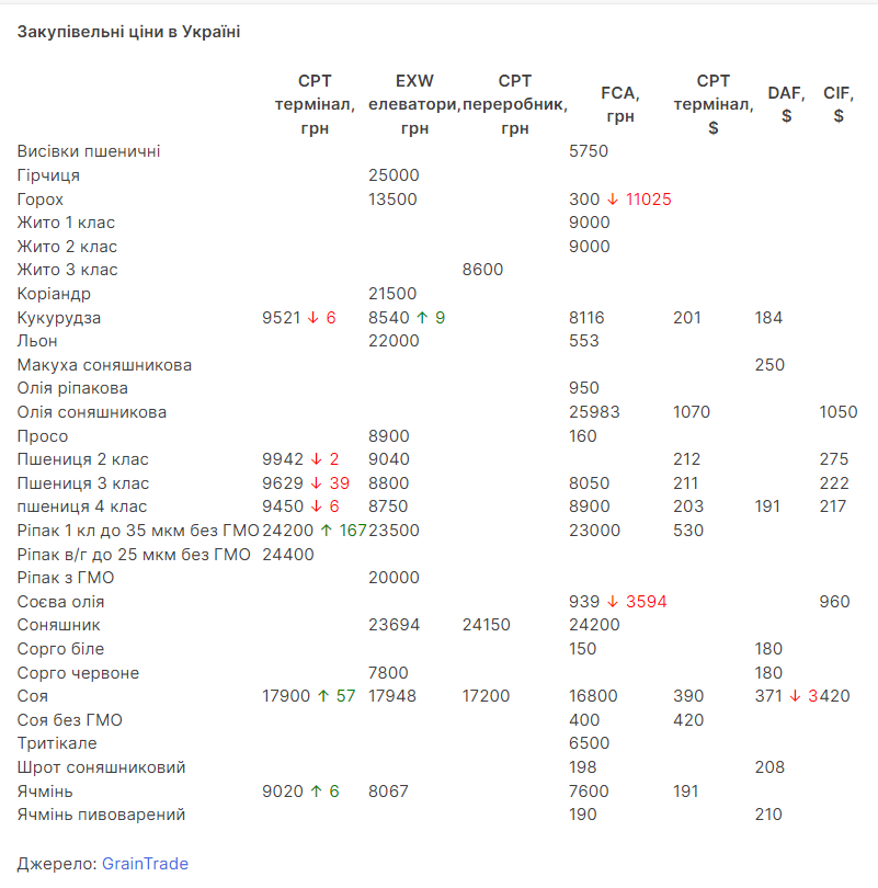 Середньозважені ціни закупівлі зернових та олійних культур в Україні на умовах CPT термінали, EXW елеватори, CPT переробники, FCA, CPT долар, FOB, DAF, CIF. Інформує AGRONAUT.