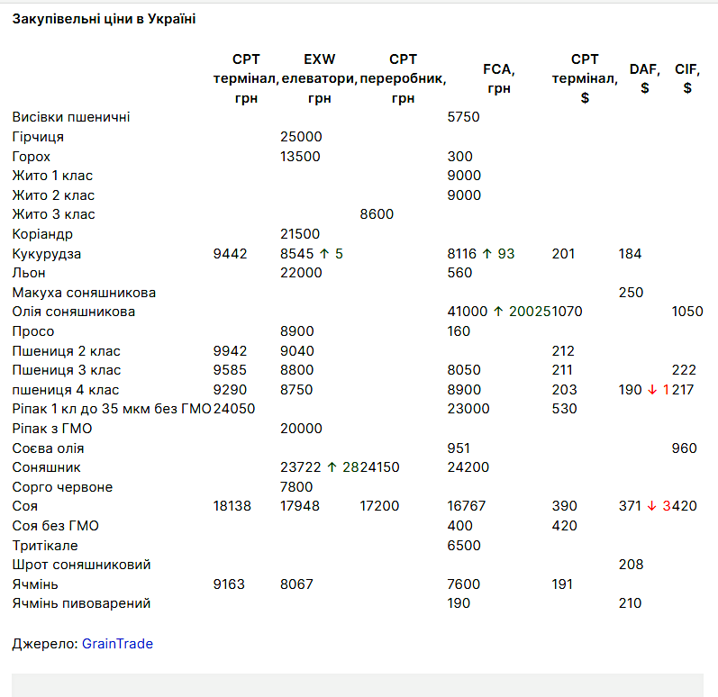 Середньозважені ціни закупівлі зернових та олійних культур в Україні на умовах CPT термінали, EXW елеватори, CPT переробники, FCA, CPT долар, FOB, DAF, CIF. Інформує AGRONAUT.