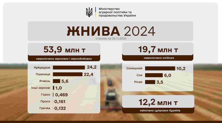 · кукурудзи – обмолочено 3,8 млн. га (або 96 %), намолочено 24, 2 млн тонн;