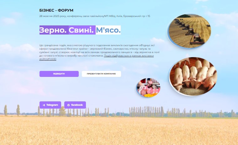 Бізнес-форум«ЗЕРНО. СВИНІ. М'ЯСО», метою якого є рішуче подолання викликів сьогодення, об'єднає всі сфери продовольчої безпеки країни – зерновий бізнес, свинарство, м'ясну галузь та суміжні галузі, створює коаліції на всіх ланках продовольчого ланцюга – від зернятка в полі до готового м’ясного виробу на столі споживача. Подія відбувається в рамках виставки AGRO2FOOD