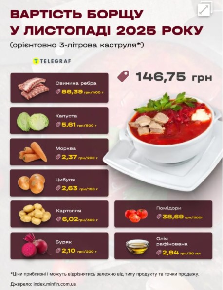 Експертка плодоовочевого ринку ІА АПК-Інформ Ксенія Гусєва заявила, що вартість білоголової капусти цієї осені втричі нижча, ніж торік. У середньому 5-10 гривень за кілограм проти 18-25 гривень минулого року. Подібне здешевлення спостерігається по всіх овочах борщового набору.