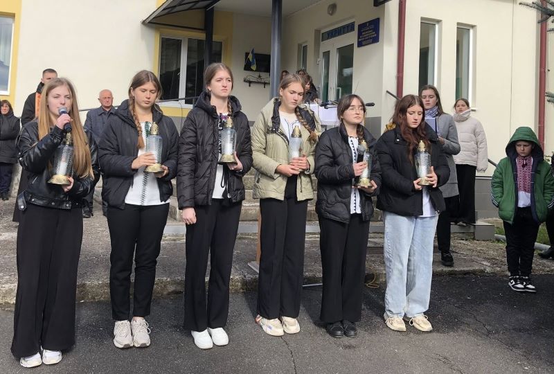 На завершення заходу учні школи поклали до пам’ятних дошок наших загиблих воїнів-земляків запалені лампадки та букети квітів. Цей момент став виявом тепла наших сердець, об’єднаних болем, але гордих, що серед нас були Герої, що серед нас були такі світлі люди, які продовжують жити у національній пам’яті, та перед Божим престолом оберігають нас молитвою.